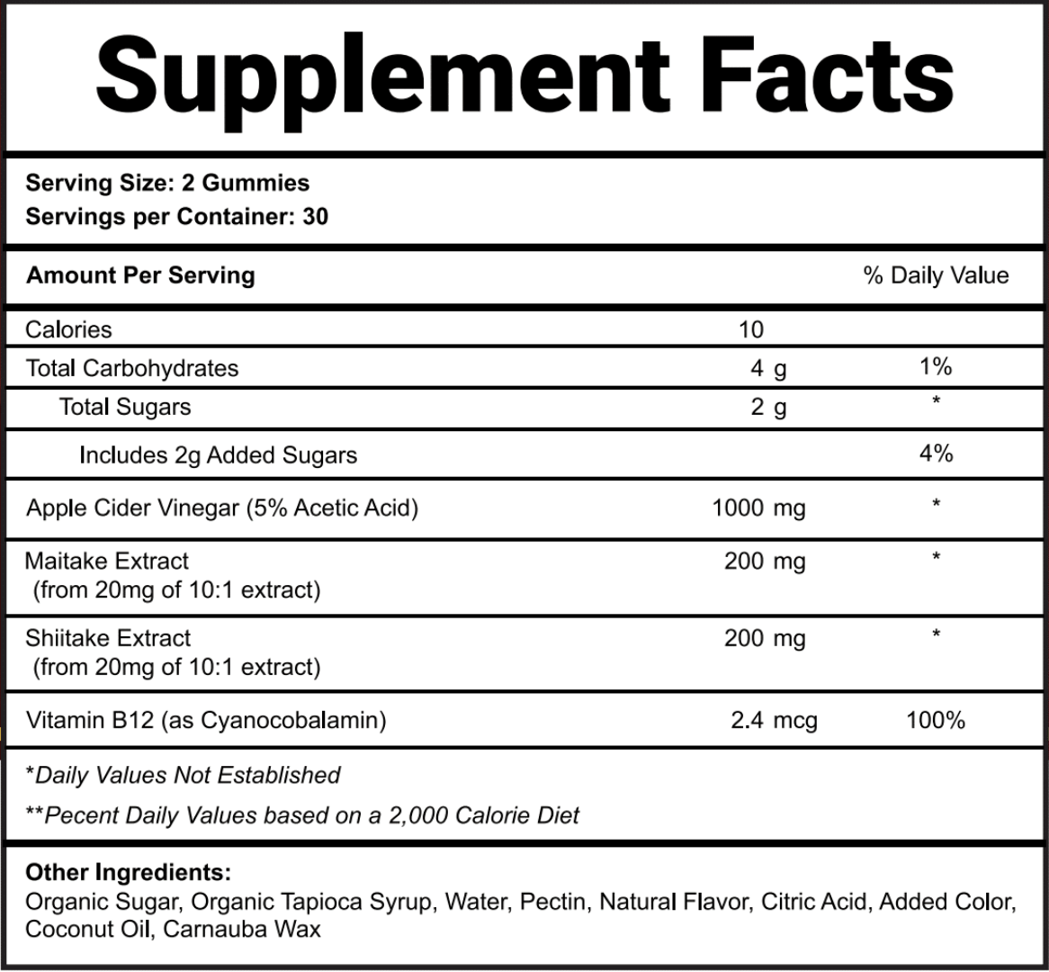 Savor the goodness: Crafted with precision and care, each gummy is a delectable treat bursting with the potential benefits of apple cider vinegar mixed with Maitake and Shitake.